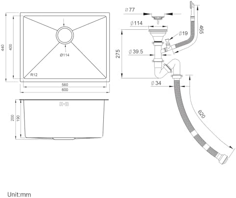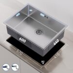 INSTALACIÓN: Las dimensiones exteriores del fregadero son 600 mm x 440 mm. El fregadero es adecuado para muebles bajos con un ancho de 60 cm o más. Instale el fregadero en su encimera desde arriba o desde abajo.