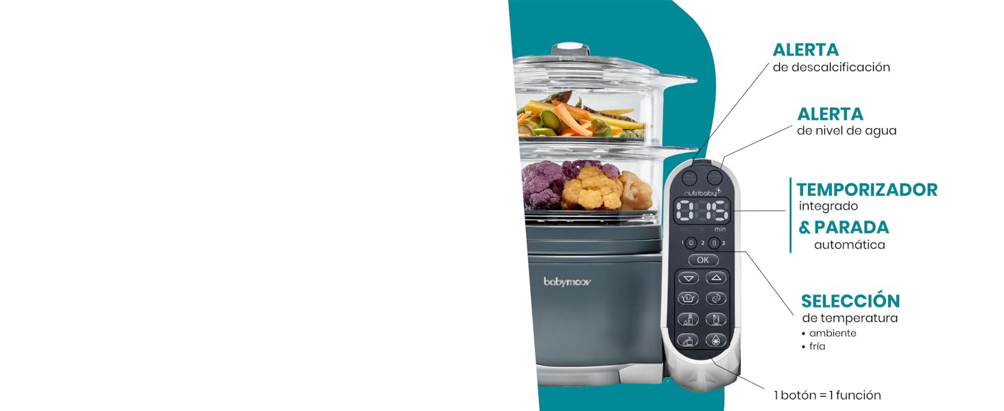 6 programas: cocinar al vapor, licuar, descongelar, calentar papillas, esterilizar y calentar biberones