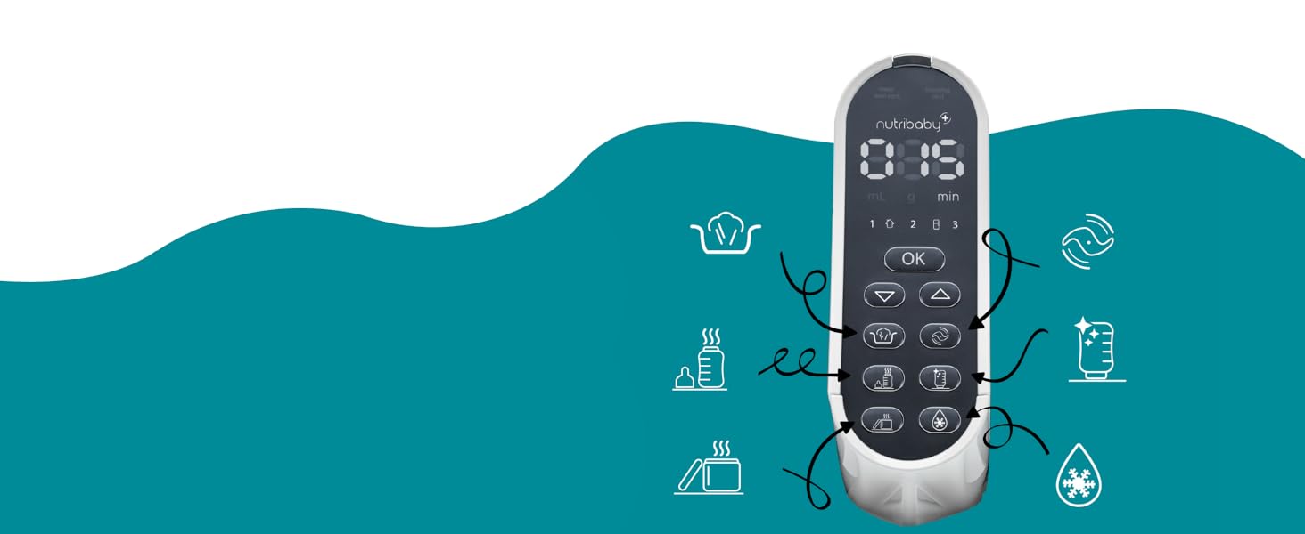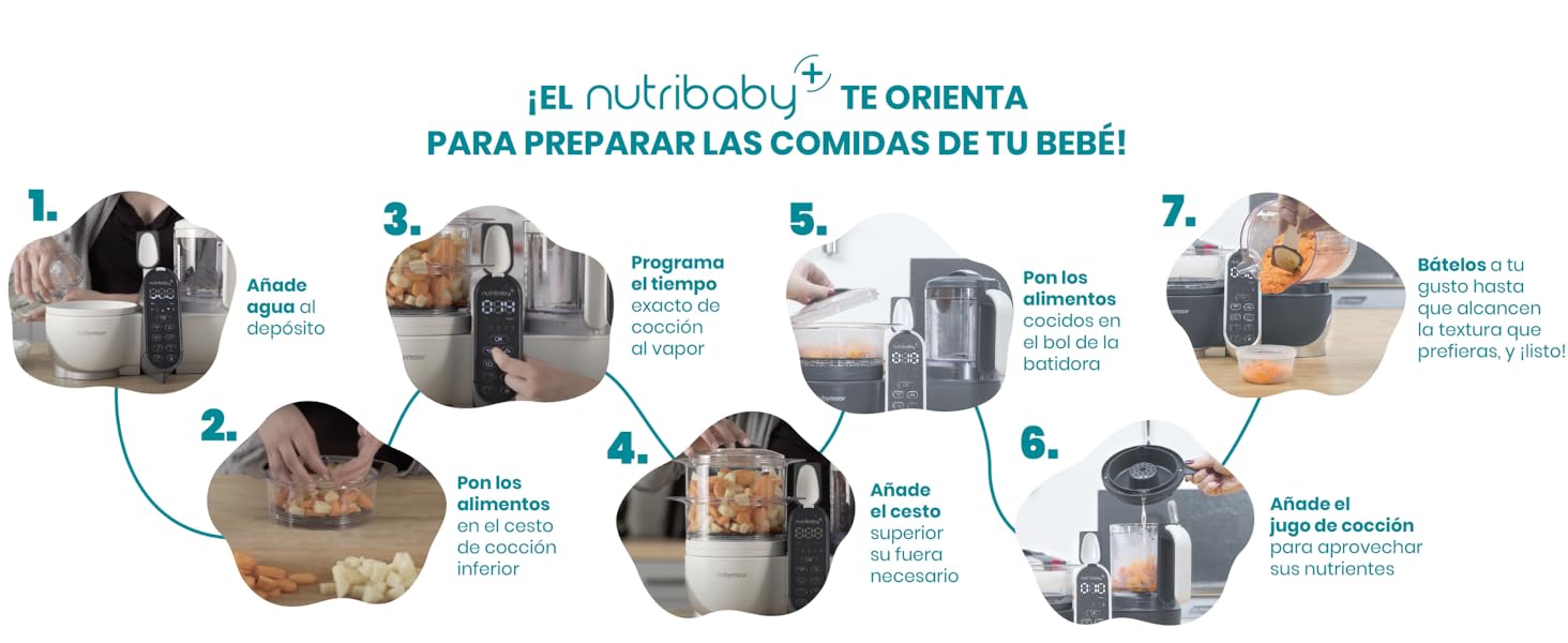 6 EN 1: el Nutribaby(+) tiene 6 funciones preprogramadas: cocinar al vapor, batir, descongelar, calentar papillas, esterilizar y calentar biberones (hasta 3 a la vez).