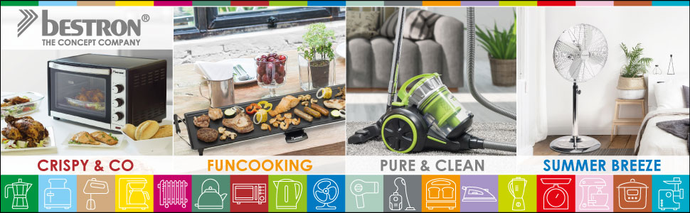 Bestron, The Concept Company ha sido durante más de 50 años una exitosa empresa familiar que produce electrodomésticos modernos de alta calidad. La marca impresiona no solo por su gama de productos orientados al precio y rendimiento, sino también por una innovadora variedad de artículos desde eléctrodomésticos cuidadosamente diseñados para el desayuno, divertidos y modernos aparatos de cocina, prácticos utensilios y hasta una amplia selección de equipos de aire acondicionado, Bestron tiene algo para todos los gustos y necesidades, porque prestando atención a los detalles, Bestron vende más que solo productos: Años de experiencia, excelente relación calidad/precio, estilo de vida moderno.