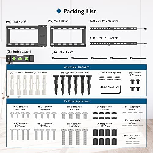 Fácil instalación: el sistema automático facilita el bloqueo y liberación rápida de su televisor. El soporte de pared para TV viene con 5 bridas para cables, un nivel de burbuja, instrucciones fáciles de entender y todos los accesorios necesarios del producto.