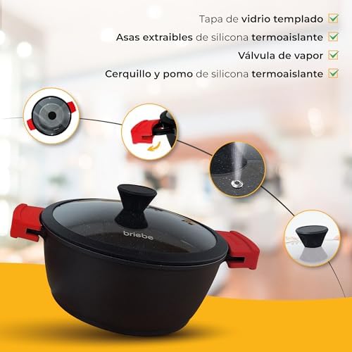 ASAS DE SILICONA: Incluye un par de asas de silicona extraíbles termo aislantes que proporcionan la máxima protección contra el calor a la hora de sujetar o mover las ollas durante el cocinado. Su diseño antideslizante garantiza un agarre firme de las cazuelas y previene las quemaduras. Se colocan con facilidad y ofrecen comodidad y seguridad en la cocina. Aptas para lavavajillas.