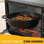 COCINA SALUDABLE LIBRE DE PFOA: El Titanio presente en el recubrimiento antiadherente de nuestras cazuelas no sufre alteración alguna al someterlas a altas temperaturas. Está libre de PFOA, no libera sustancias tóxicas ni altera el sabor de los alimentos. Permite cocinar con una cantidad mínima de aceite o grasa sin que los alimentos se peguen a la pieza y favorece una cocina más saludable y menos calórica.