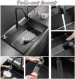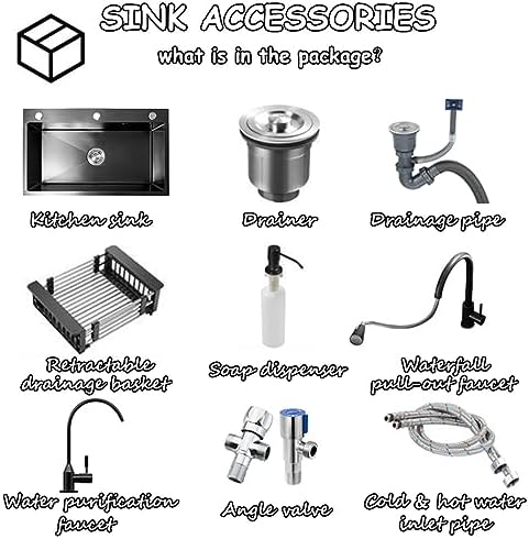 【Juego completo de kits de fregadero de cocina】 – 1 * tanque de agua nanométrico, 1 * tubería de alcantarillado, 1 * salida de drenaje, 1 * grifo extraíble de acero inoxidable 304, 1 * cesta telescópica, 1 * dispensador de jabón, 1 * grifo de purificación, 2 * tubería de entrada de agua fría y caliente, 2 * válvula de ángulo fría y caliente. No se necesitan otros accesorios, el conjunto completo satisface sus necesidades.