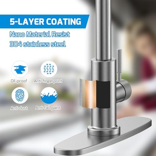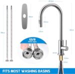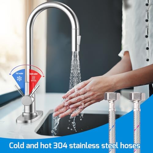 Excelente calidad: el cuerpo principal está hecho de acero inoxidable 304 de alta calidad y equipado con una base resistente para una instalación más estable. La superficie está tratada con un cepillado antioxidante para evitar rayones y polvo; Tuberías de agua fría/caliente trenzadas de acero inoxidable, longitud de 59 cm, interfaz estándar de 3/8 de pulgada, pasan un estricto control de calidad, cumplen con los estándares de uso y garantizan un consumo de agua saludable.