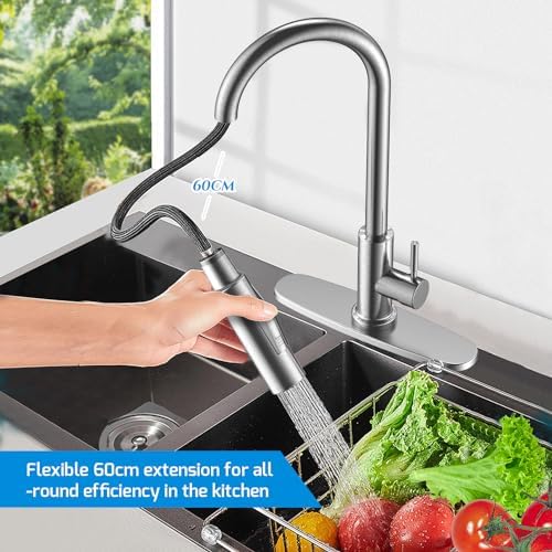 Limpieza Integral: El grifo tiene una manguera retráctil incorporada de 60 cm y el cabezal de la ducha se puede sacar fácilmente y volver a su posición original después de su uso; Con un diseño giratorio de 360°, diga adiós al antiguo método de descarga fija. y puede alcanzar todos los ángulos para un mayor efecto de limpieza.