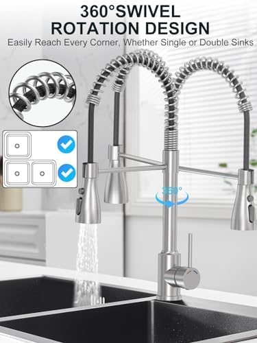 (Grifo con función giratoria de 360°): Nuestro grifo de cocina accionado por resorte con una sola palanca para controlar fácilmente la temperatura del agua y el caudal, giro de arco alto de 360 ​​grados y boquilla rociadora extraíble me permite trabajar fuera del fregadero de la cocina. la cocina, llenando el cubo con agua cuando el fregadero está ocupado y la función extraíble hace que limpiar el fregadero sea pan comido.