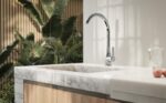 El grifo de la cocina se puede girar 360° para que el agua fluya en cualquier ángulo sin ocupar espacio en el fregadero y también se adapta a varios fregaderos.