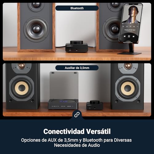 【Experiencia Inmersiva de Alta Fidelidad)Desarrollado por el chip Texas de alto rendimiento TPA3116, este amplificador estéreo logra una SNR que supera los 100 dB, THD por debajo del 0,04 % y cubre un amplio rango de frecuencia de 20 Hz a 20 kHz, asegurando un equilibrio óptimo entre volumen y detalle. . Esto le ofrece una experiencia auditiva inmersiva de alta fidelidad.
