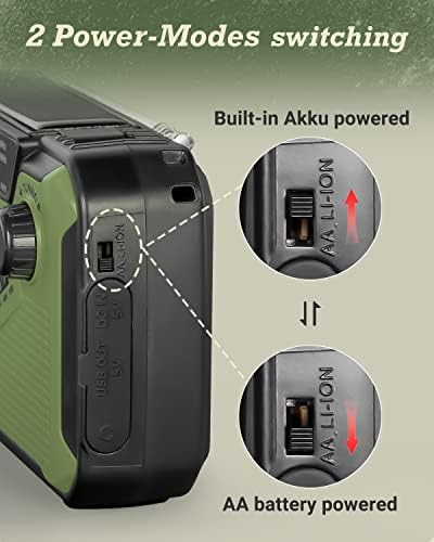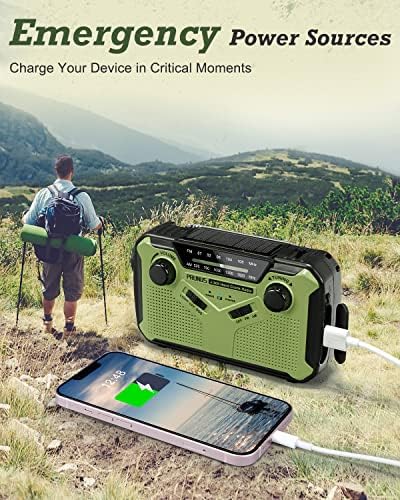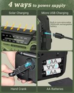 【4 Formas de cargarla)Equipada con una batería recargable integrada de 3000 mAh (no extraíble), la radio usb portatil tiene 4 opciones de carga. La carga por USB para la vida diaria es la mejor opción. La manivela y el panel solar son un complemento esencial para acampar o utilizarla en caso de emergencia. Cuando se alimente con 3 pilas AA (no incluidas), cambie al modo «AA». ¡La radio pilas no perderá batería en ninguna emergencia! (Nota: Solo puede cargar la batería interna de la radio).