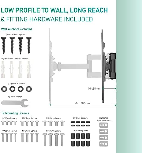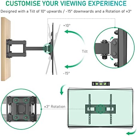 Este resistente soporte para TV es de alta calidad, tiene una larga vida útil y una flexibilidad extrema para ofrecerle personalización para su experiencia visual. Viene con todos los accesorios, herramientas e instrucciones necesarios, además de un cable HDMI, un nivel de burbuja y 5 bridas para cables.