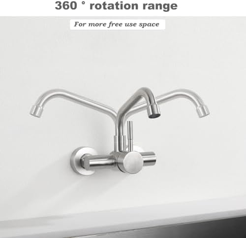 【Giratorio de 360°】El mezclador de cocina de pared con un rango de giro de 360° gira en todas las direcciones, especialmente para fregaderos dobles. Uso cómodo gracias al ángulo y altura adaptados del caño.