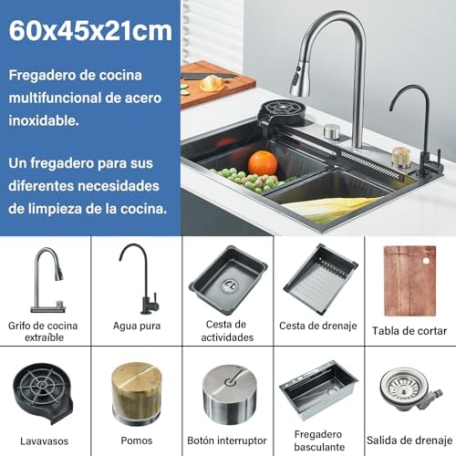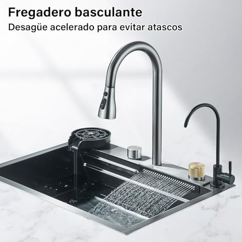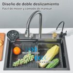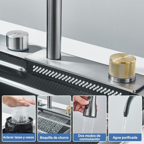 Fregadero multifunción: integra grifo, dispensador de jabón, agua pura, cascada, tabla de cortar, escurridor y otros usos en uno. Múltiples funciones en una. Puedes preparar y lavar tus comidas fácilmente sin ensuciar.
